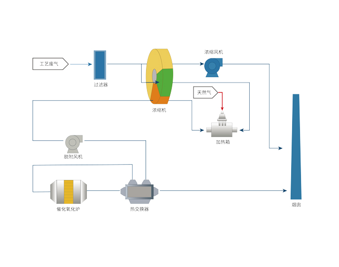 大风量低浓度的VOCs,经过沸石转轮后,由于分子之间的范德华力,VOCs被沸石微孔所吸附,净化后的气体可直接排到排气筒。被吸附在沸石转轮上的有机物再通过180℃~200℃的温度的气体进行脱附。脱附出来的高浓度废气再送入RCO炉进行催化燃烧处理。